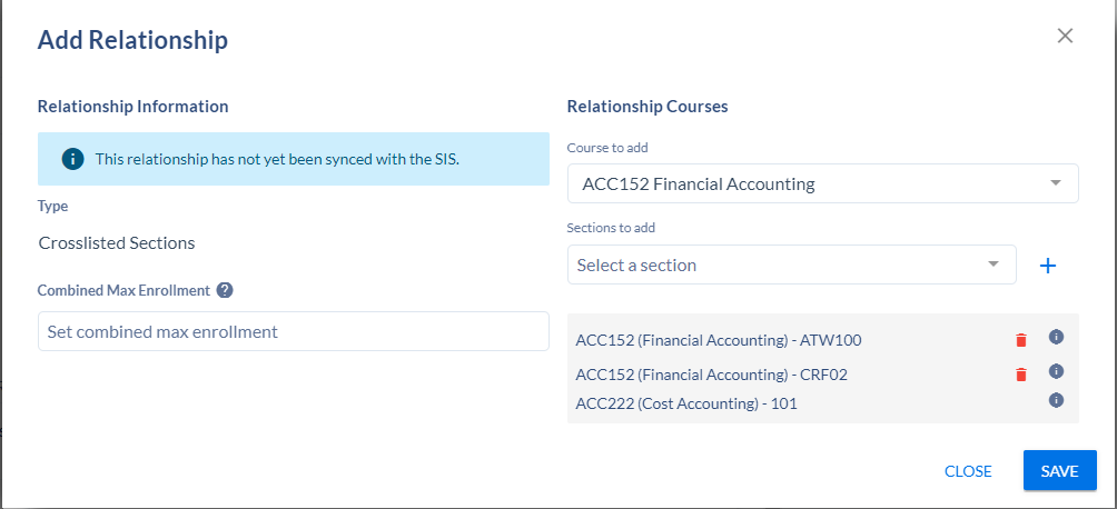 To add a Relationship (Cross-list) to a section, click +CROSSLISTED SECTIONS. This will open the Add Relationship dialogue box.