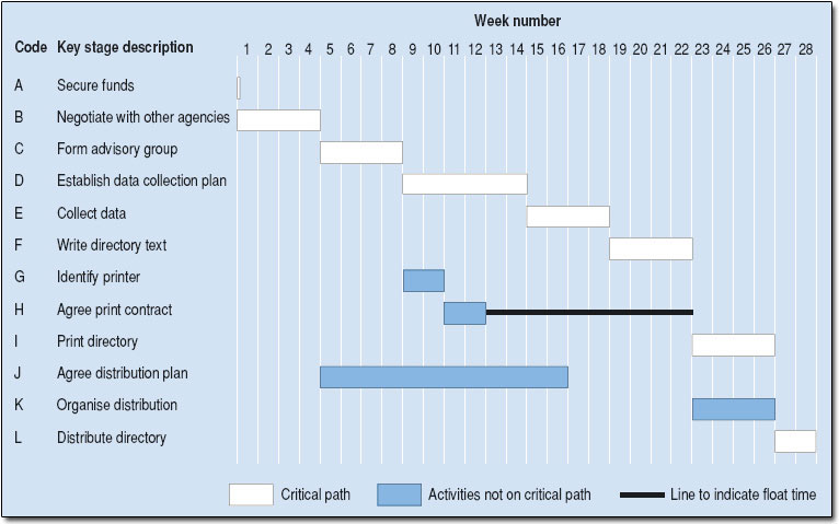 In this example in Figure 10.8, key stage K (Organize distribution) starts at week 23 so that its end point coincides with key stage L (Distribute directory). However, K could begin as early as week 17, as soon as key stage J is completed. Key stage K is therefore said to have “slack.” Key stage H (Agree print contract) has been placed to end at week 12. However, it could end as late as week 22, because key stage I (Print directory) does not begin until week 23. Key stage H is therefore said to have “float.” Float time can be indicated on the chart by adding a line ahead of the bar to the latest possible end point. Slack and float show you where there is flexibility in the schedule, and this can be useful when you need to gain time once the project is up and running.