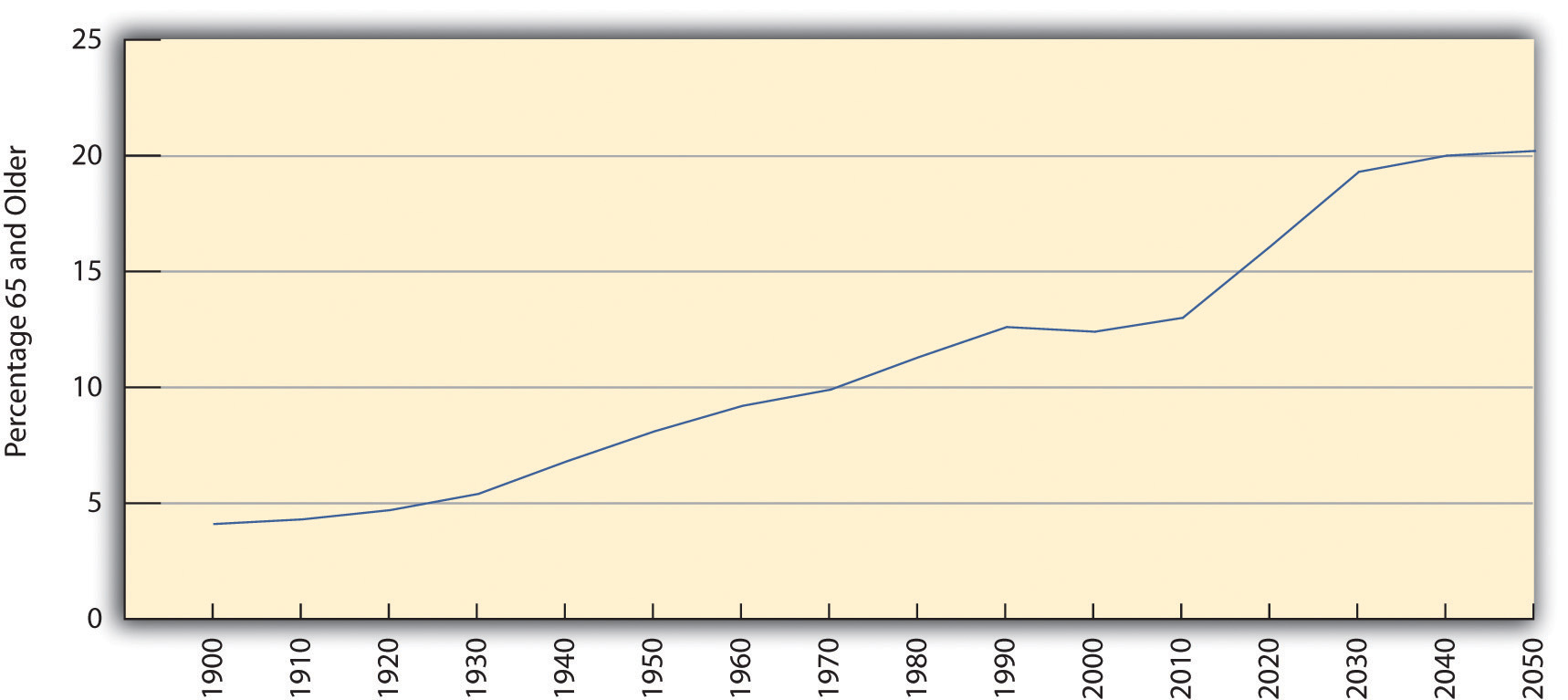 During the next few decades, the numbers of the elderly will increase rapidly thanks to the large baby boom generation born after World War II (from 1946 to 1964) that is now entering its mid-60s. Figure 12.4 “Past and Projected Percentage of U.S. Population Aged 65 or Older, 1900–2050” shows the rapid rise of older Americans (65 or older) as a percentage of the population that is expected to occur. Elders numbered about 3.1 million in 1900 (4.1% of the population), number about 40 million today, and are expected to reach 89 million by 2050 (20.2% of the population). The large increase in older Americans overall has been called the graying of America and will have important repercussions for elderly care and other aspects of old age in the United States, as we discuss later.